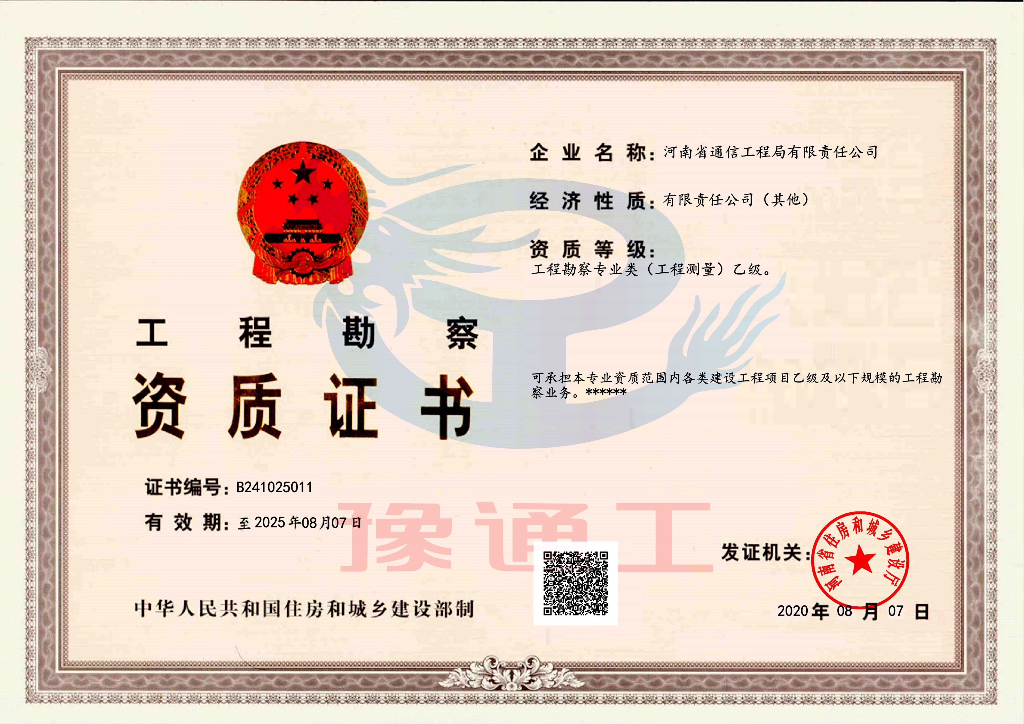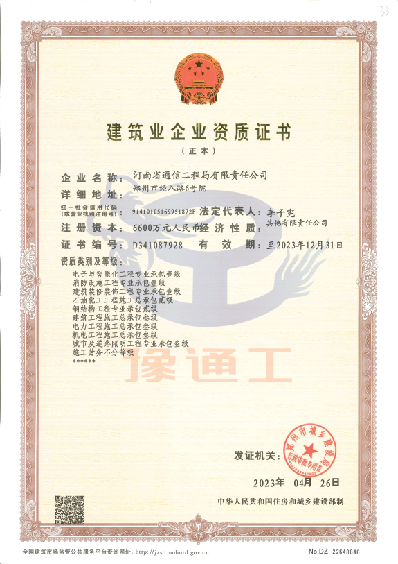 電子與智能化、建筑裝修裝飾、消防設施工程專業承包壹級;鋼結構工程專業承包貳級;建筑工程、電力工程、機電工程、城市及道路照明工程專業施工總承包叁級;施工勞務不分等級。